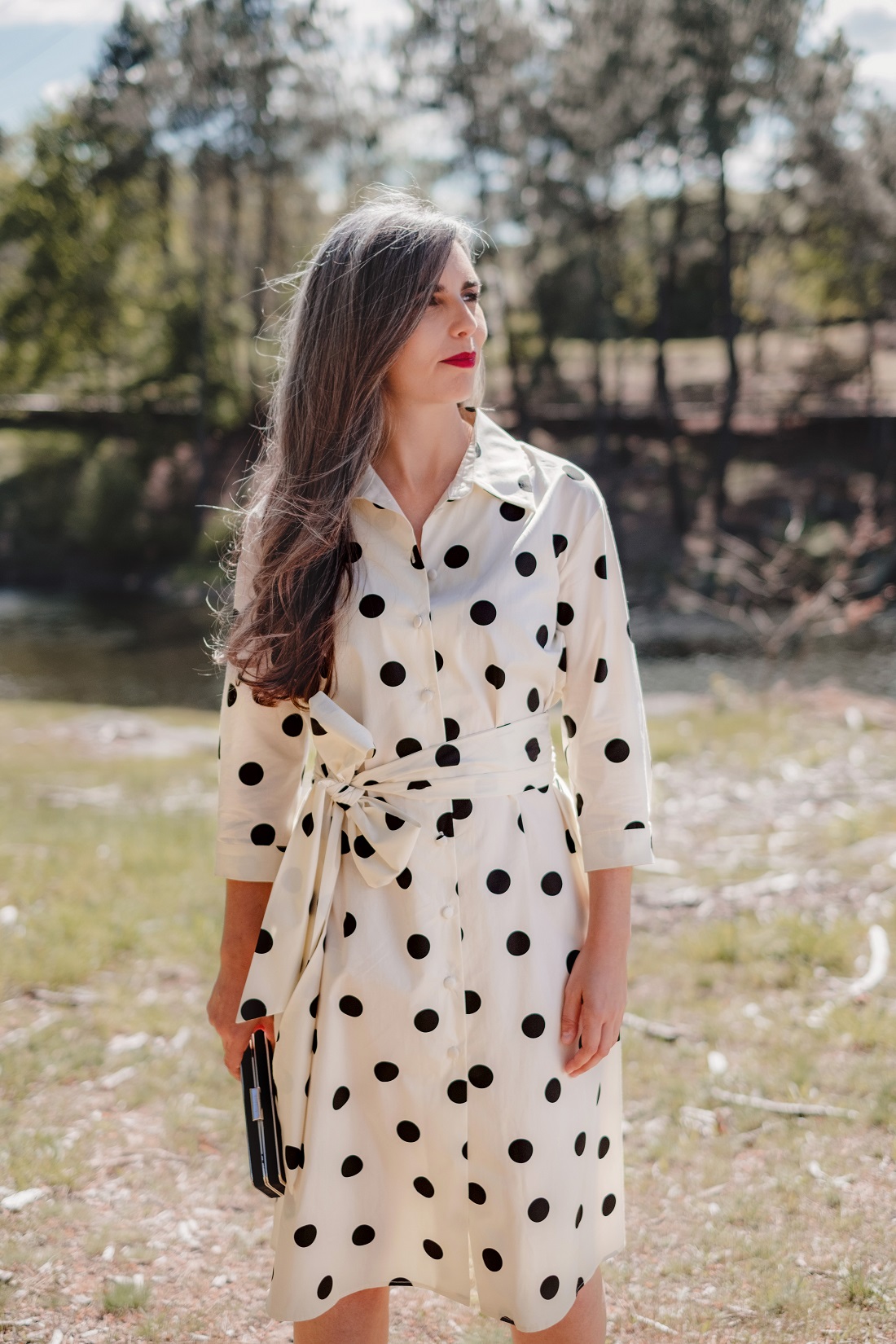 - En versión corta un vestido con corte clásico pero muy actual, con fondo blanco y lunar grande en negro con cinturón en el mismo tejido.