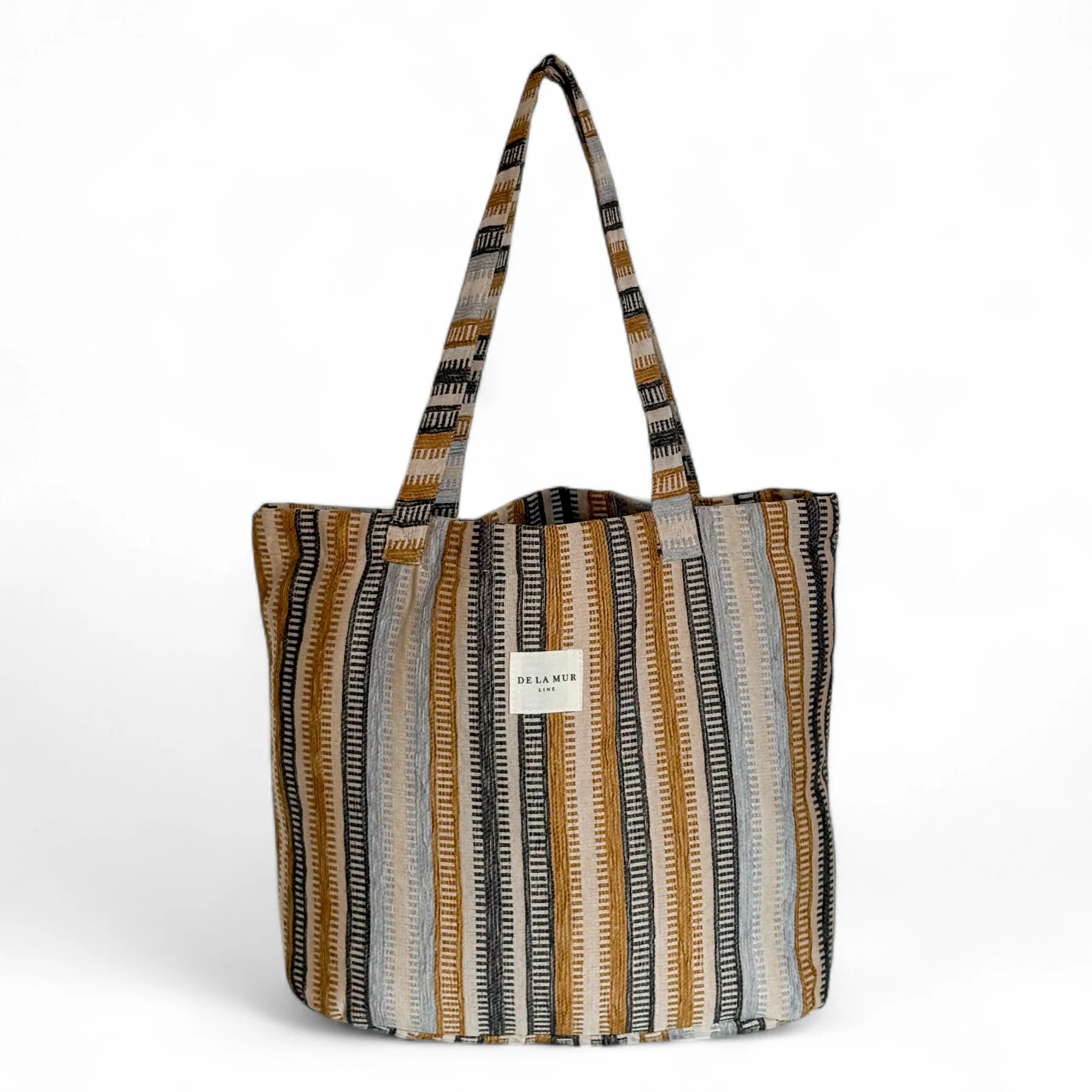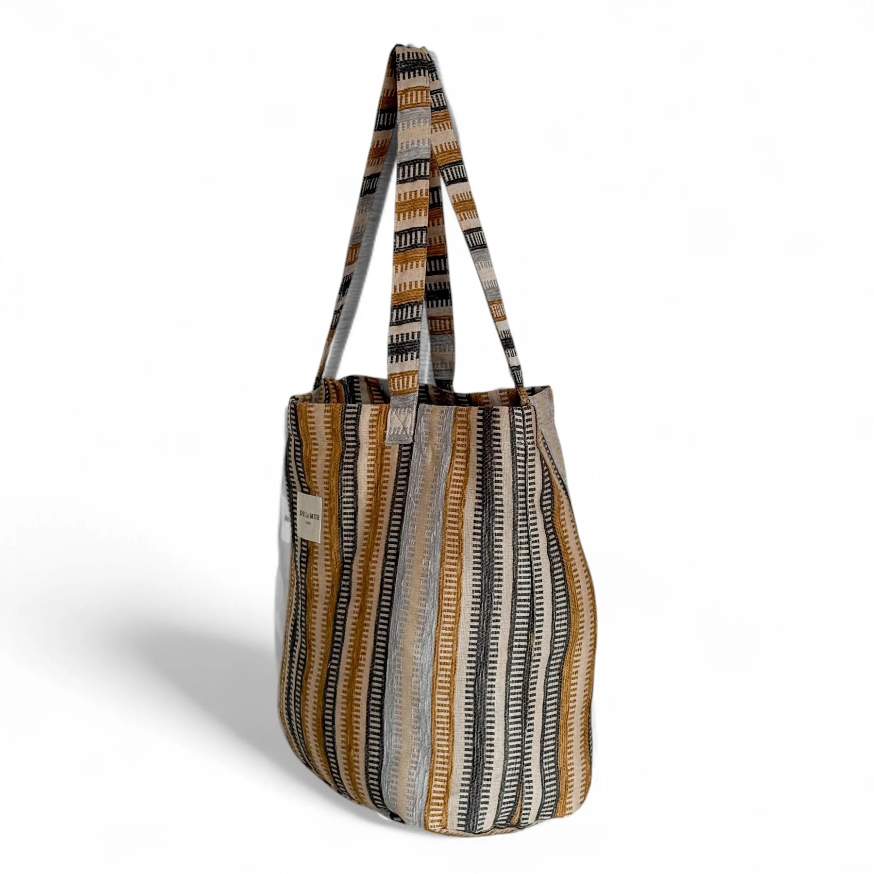 Bolsa shopper grande con asas para llevar al hombro. Con tejido grueso de jacquard con estampado a rayas en tonos grises y mostaza. Para su correcto mantenimiento se aconseja lavarlo en frío a mano y no utilizar la secadora.