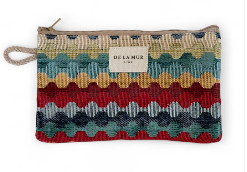 Mini neceser con cremallera superior y asa lateral de cordón beige, práctico y fácil de llevar. Confeccionado en tejido jacquard grueso multicolor, un diseño elegante y resistente. Cada pieza es única, ya que el motivo puede variar según el corte de la tela.