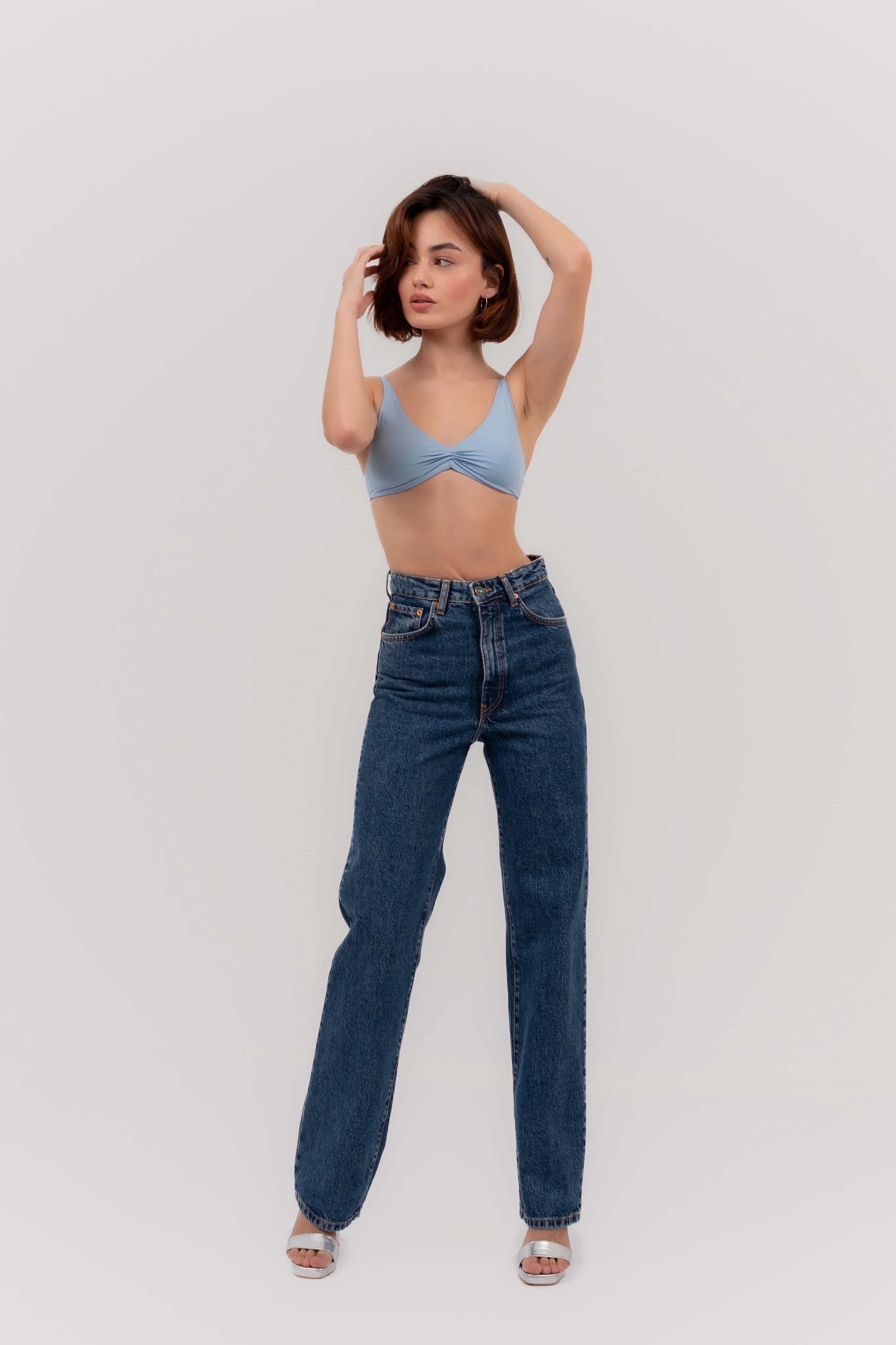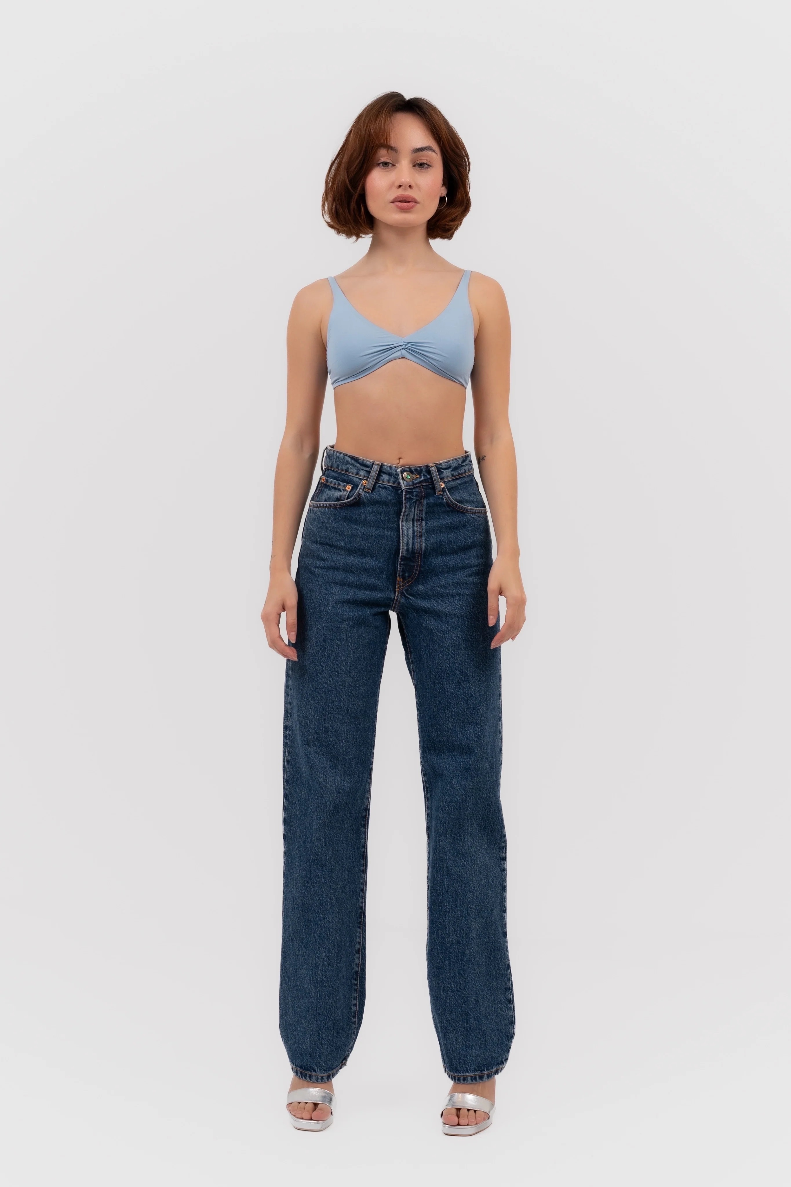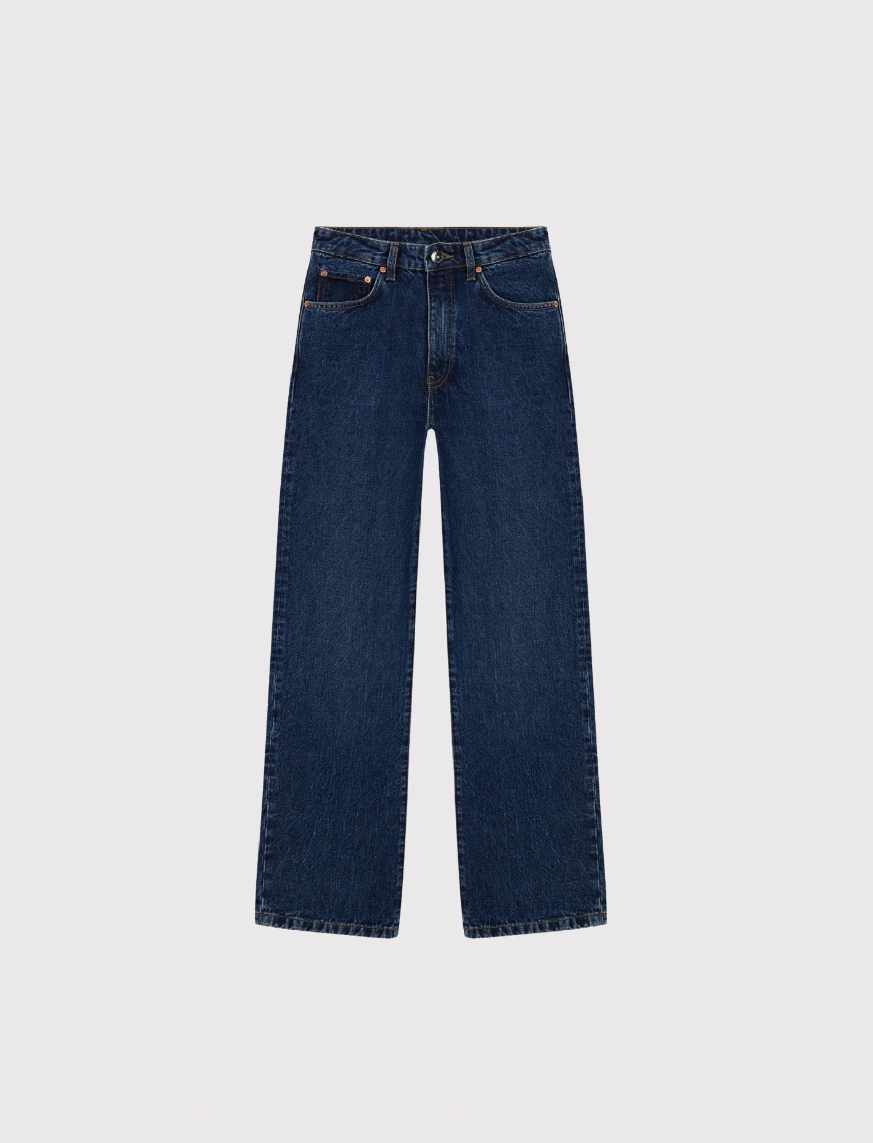 Pantalón Vague unisex de corte straight y tiro medio-alto, confeccionado en denim dark blue lavado de calidad superior.