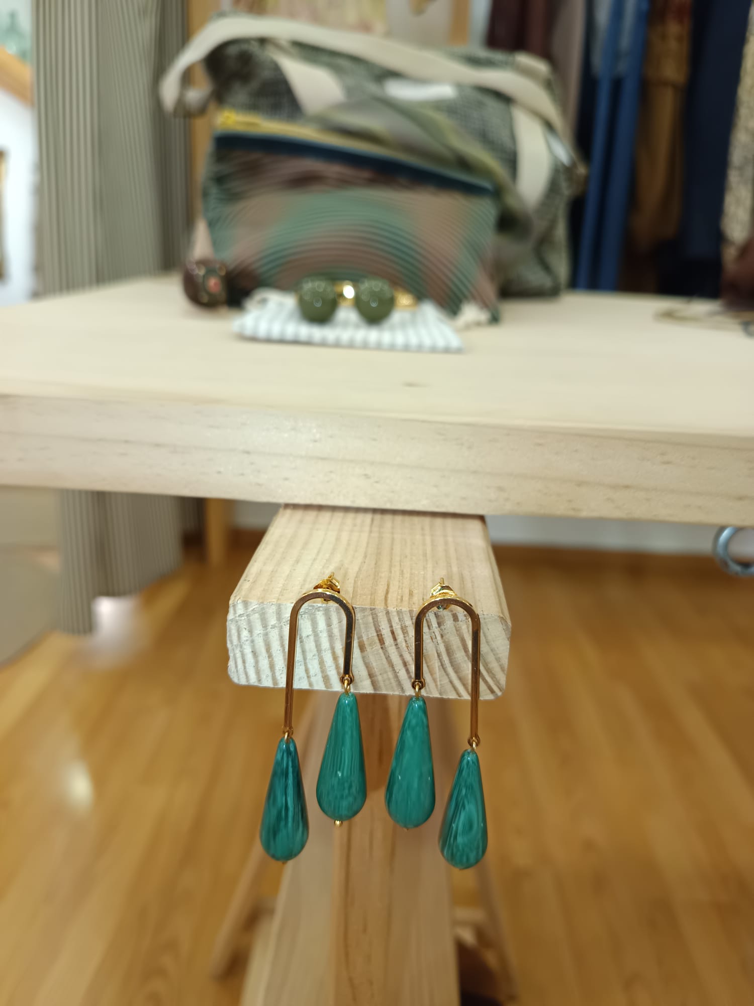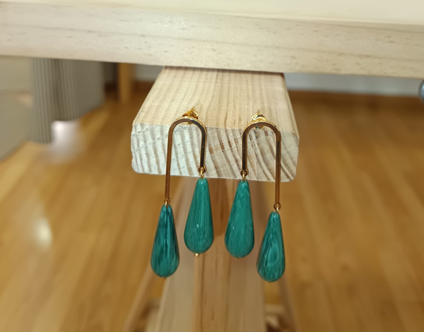 Pendientes simétricos en resina verde, chapados en oro de 16k.