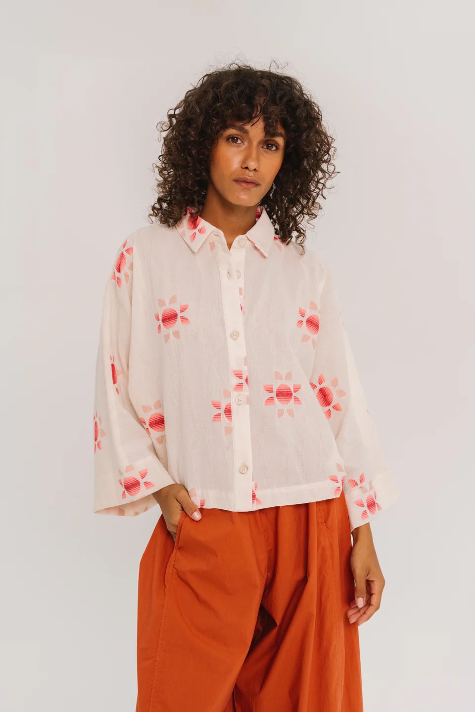 Camisa corta y extragrande con motivos de soles tejidos que aportan un detalle distintivo.