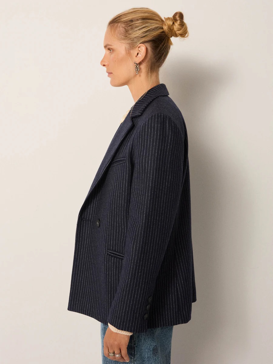 Blazer de corte cruzado, mezcla de lana marino con finas rayas diplomáticas.