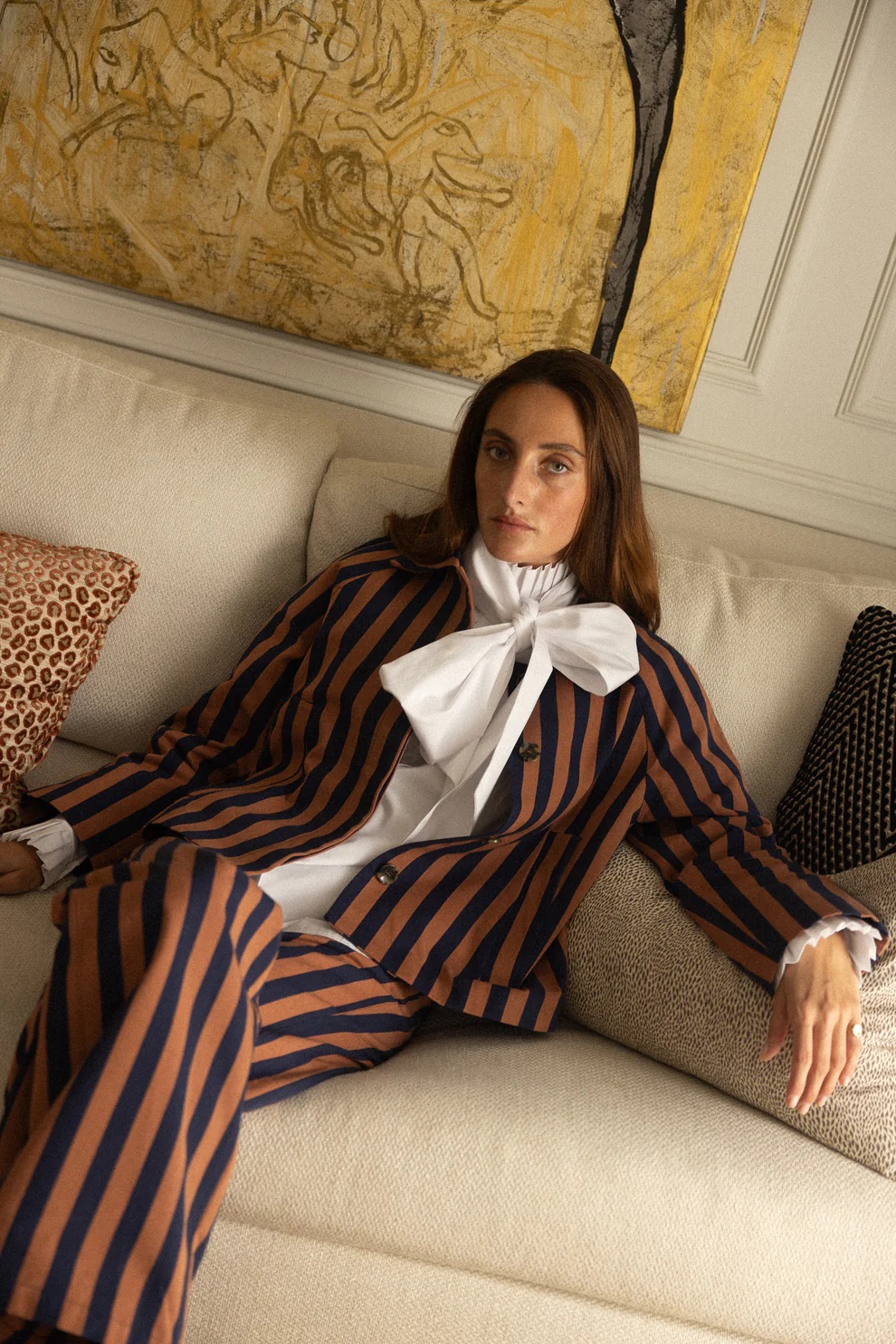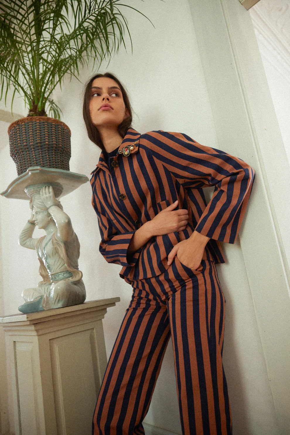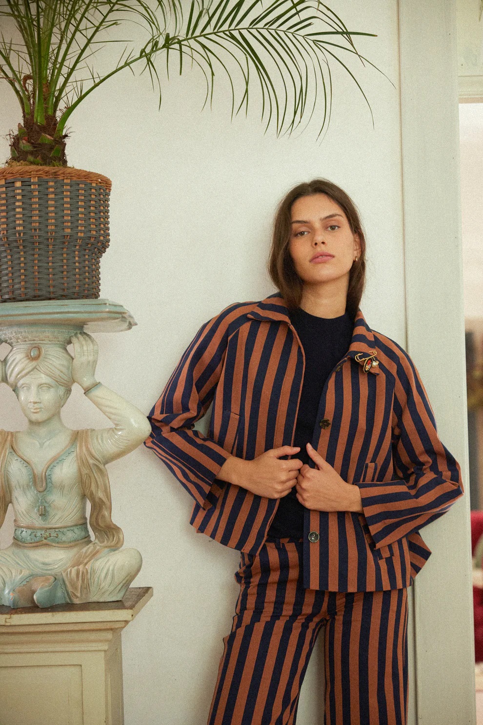 Presenta un diseño a rayas sutiles, con bolsillos laterales funcionales y un elegante cruce frontal con botones ocultos que aportan un acabado limpio y minimalista.