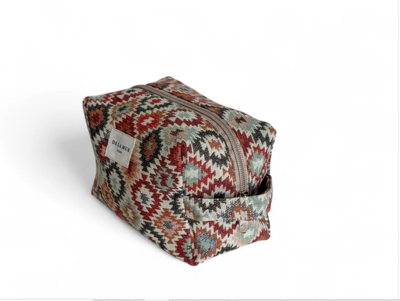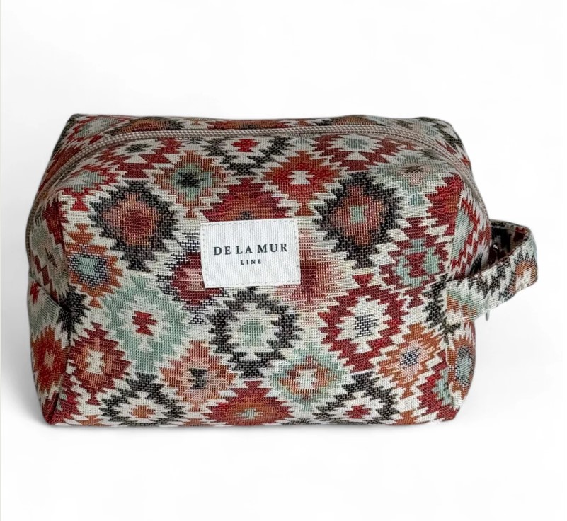 Dale estilo a tu organización diaria con este neceser mediano, diseñado con cremallera superior y asa lateral para un uso cómodo y práctico. Elaborado en tejido grueso de jacquard con un estampado geométrico multicolor, combina resistencia y personalidad en una sola pieza.