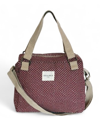 Bolso mediano con asa larga ajustable y dos asas superiores confeccionado en cinta de espiga de algodón granate con una fina línea negra decorativa. Realizado en tejido grueso tipo tapicería, resistente y con un acabado elegante.