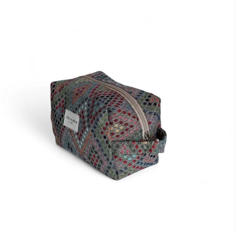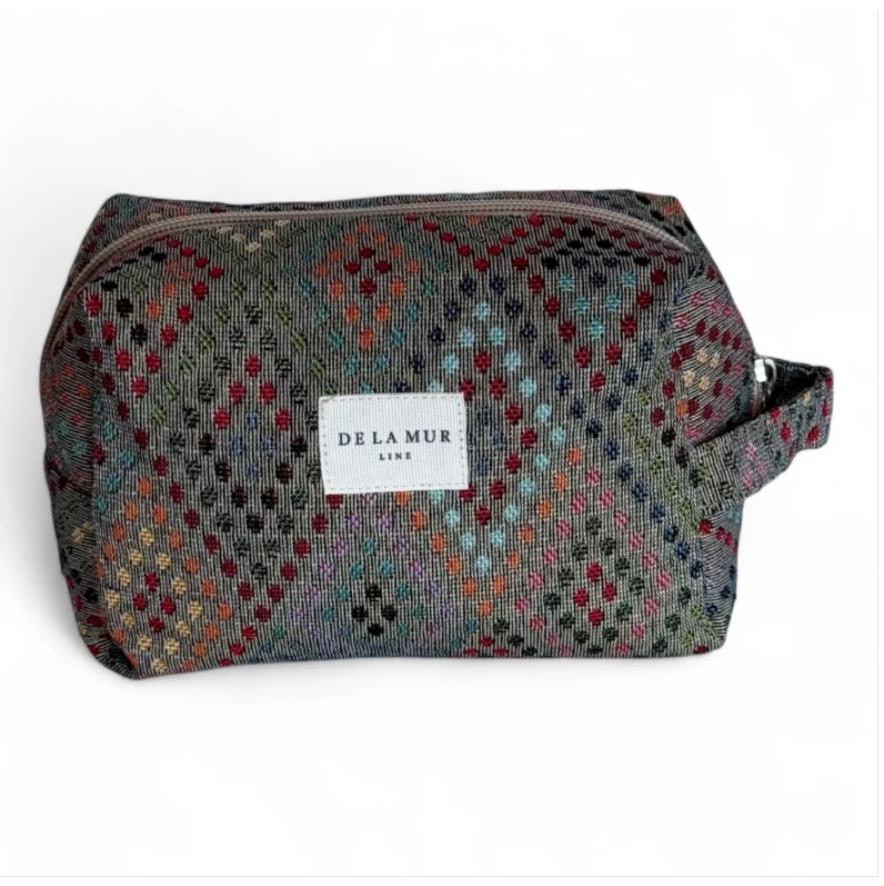 Dale estilo a tu organización diaria con este neceser mediano, diseñado con cremallera superior y asa lateral para un uso cómodo y práctico. Elaborado en tejido grueso de jacquard con un estampado geométrico multicolor, combina resistencia y personalidad en una sola pieza.