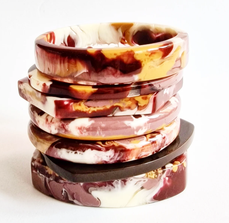 Los tonos burdeos, crema y ámbar se mezclan con sutiles destellos sobre la resina, dando lugar a piezas irrepetibles. Ningún brazalete es igual a otro.