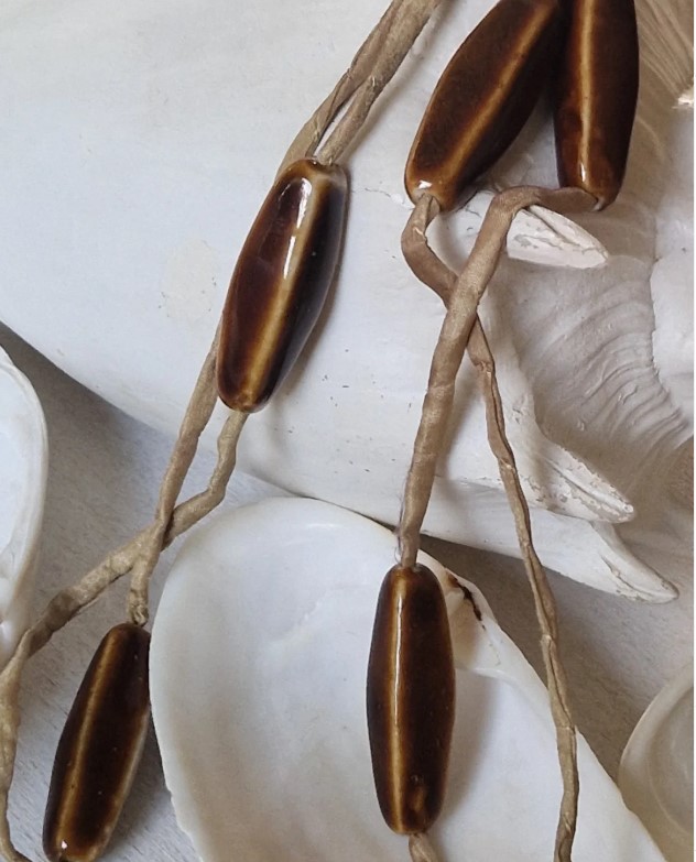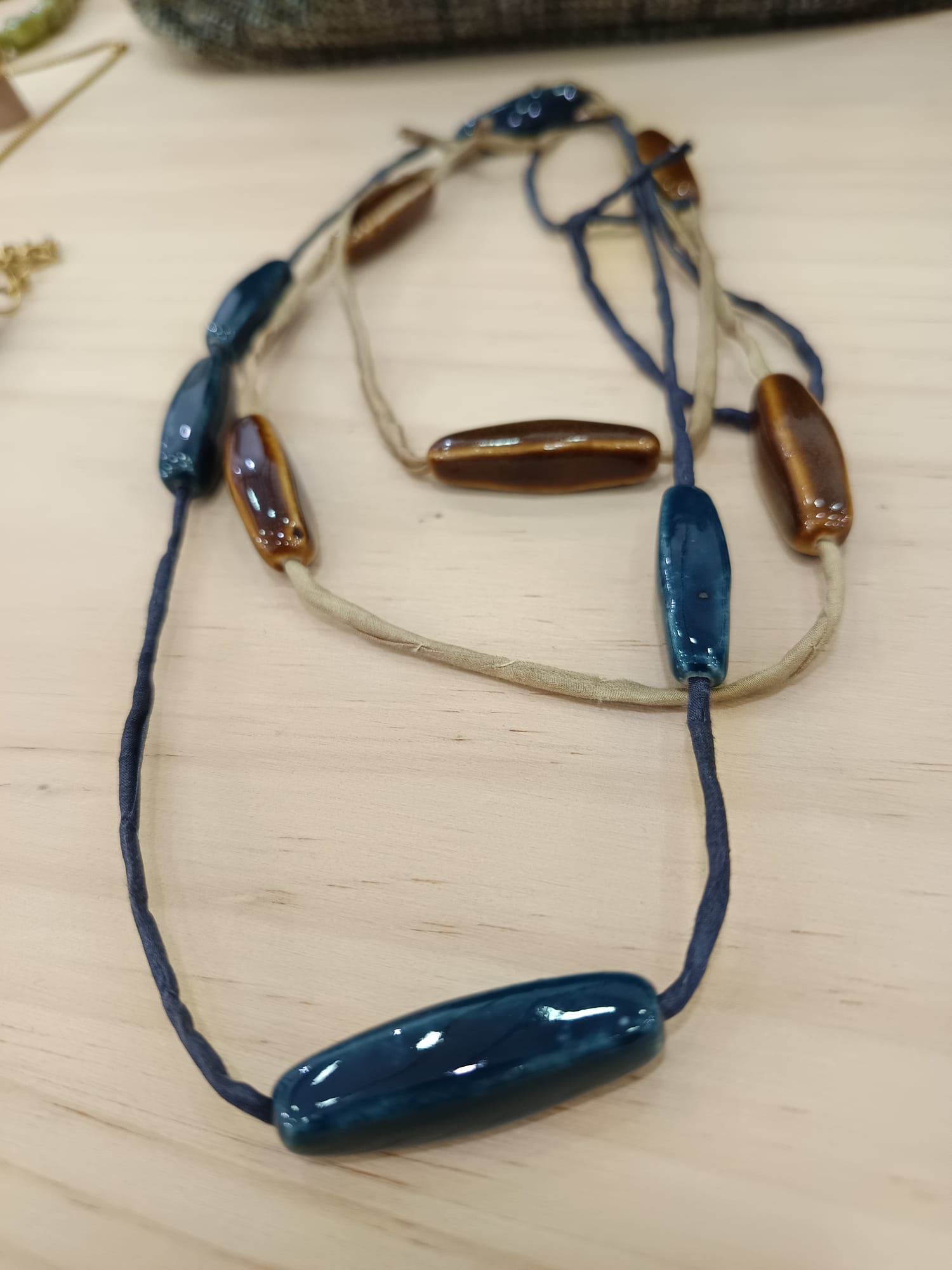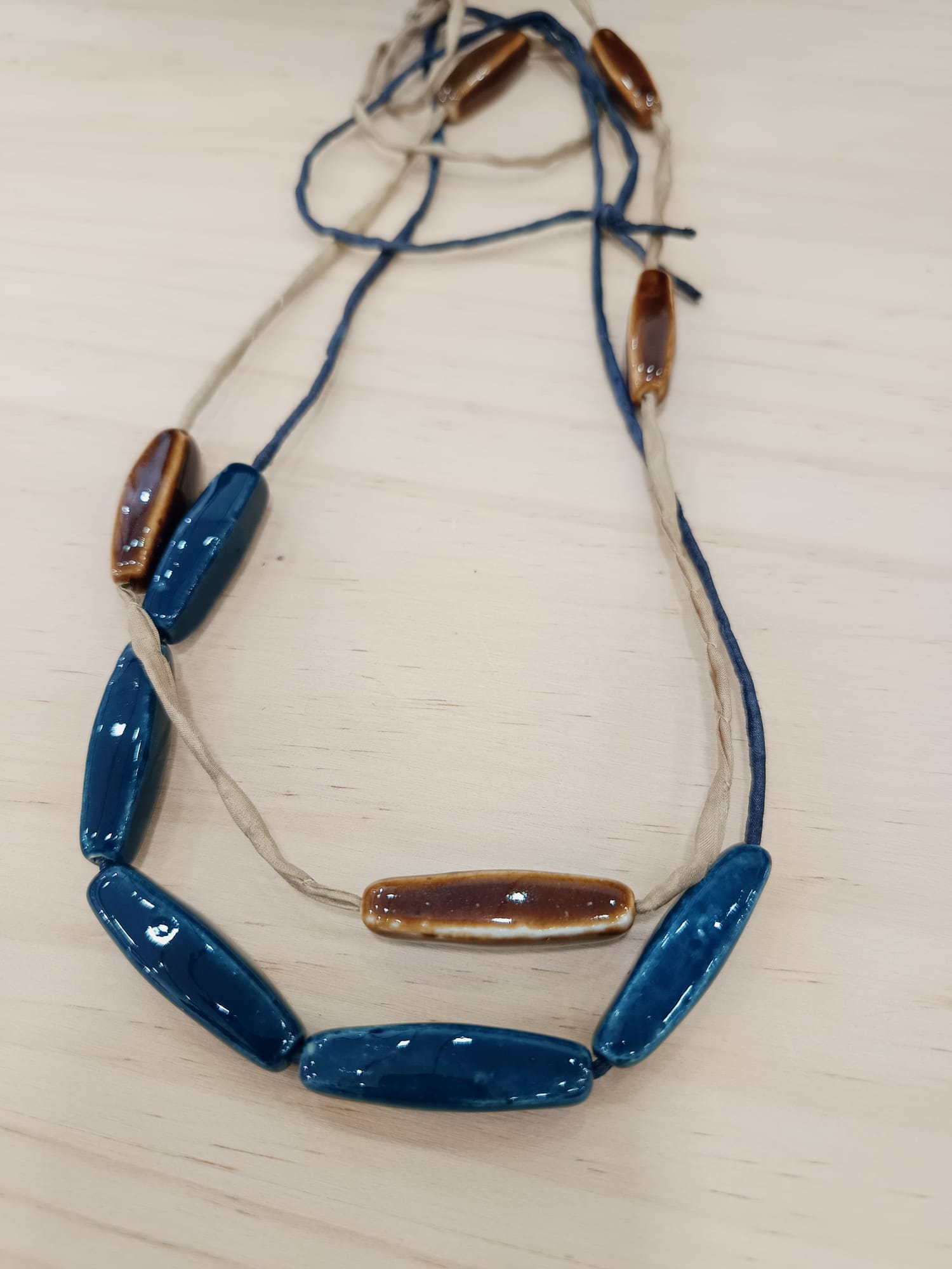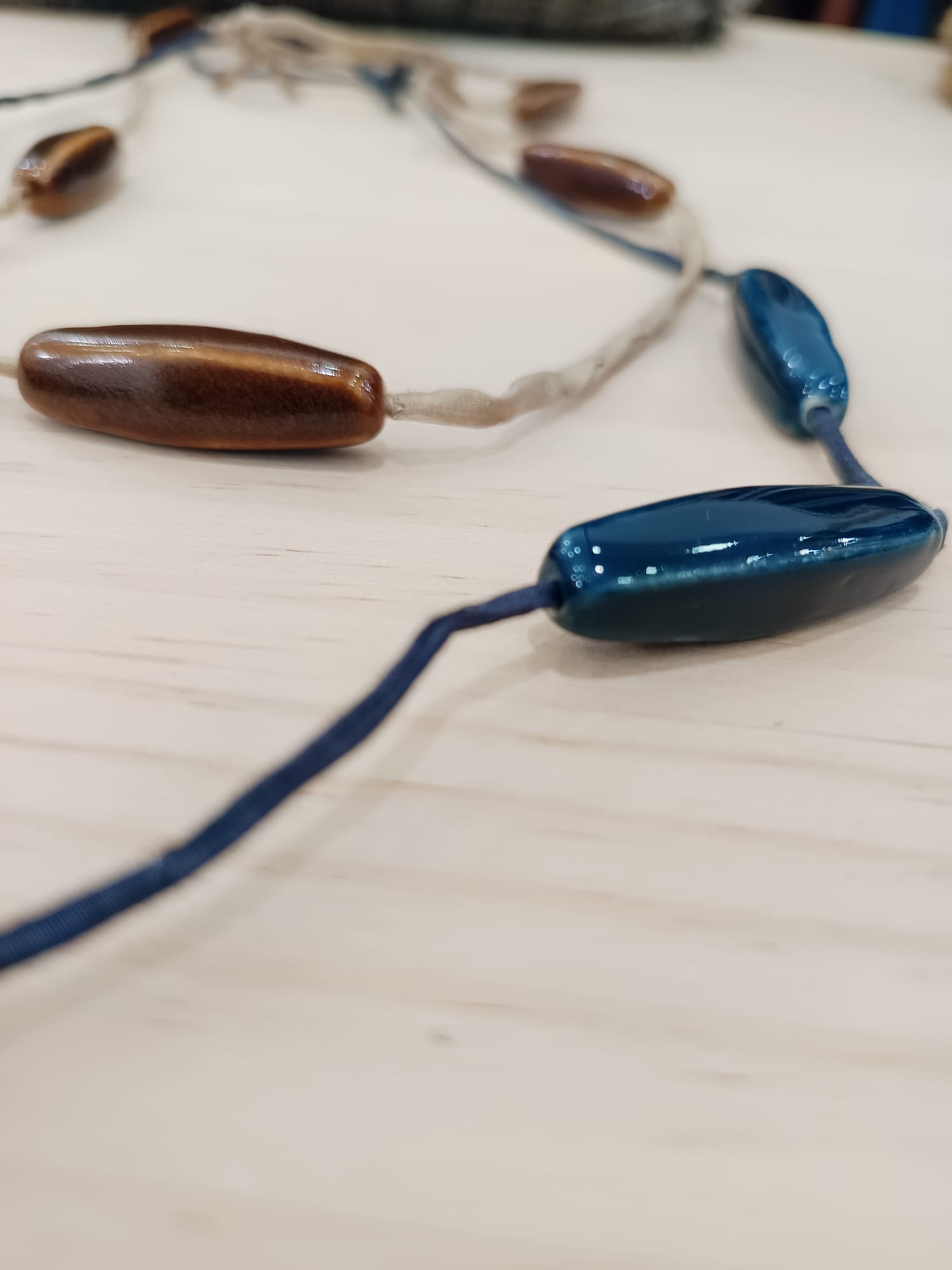 Este collar artesanal destaca por sus cuentas de color marrón o azul oscuro, que se combinan perfectamente con el cordón natural, creando una pieza de estilo bohemio y orgánico. Las cuentas, con un acabado suave y brillante, tienen un diseño alargado que evoca una sensación de elegancia y sencillez. La textura del cordón resalta la belleza de las cuentas, mientras que el diseño ligero y fluido de la pieza lo hace ideal para cualquier ocasión, desde un día casual hasta una salida más especial. Un accesorio perfecto para quienes buscan un toque natural y moderno en su estilo diario.