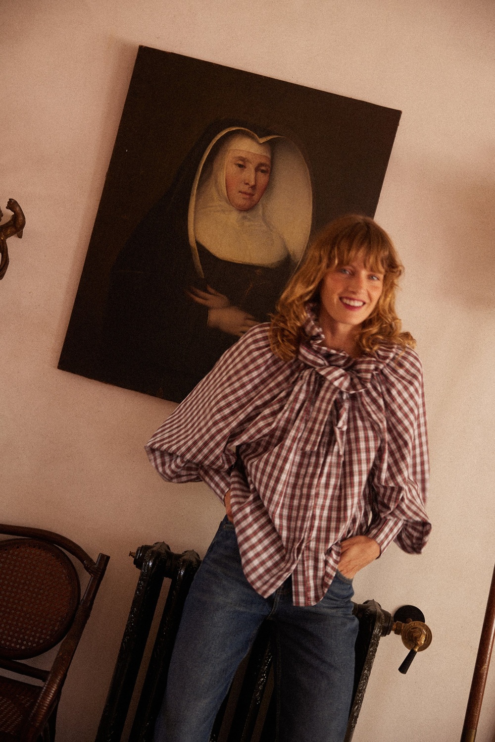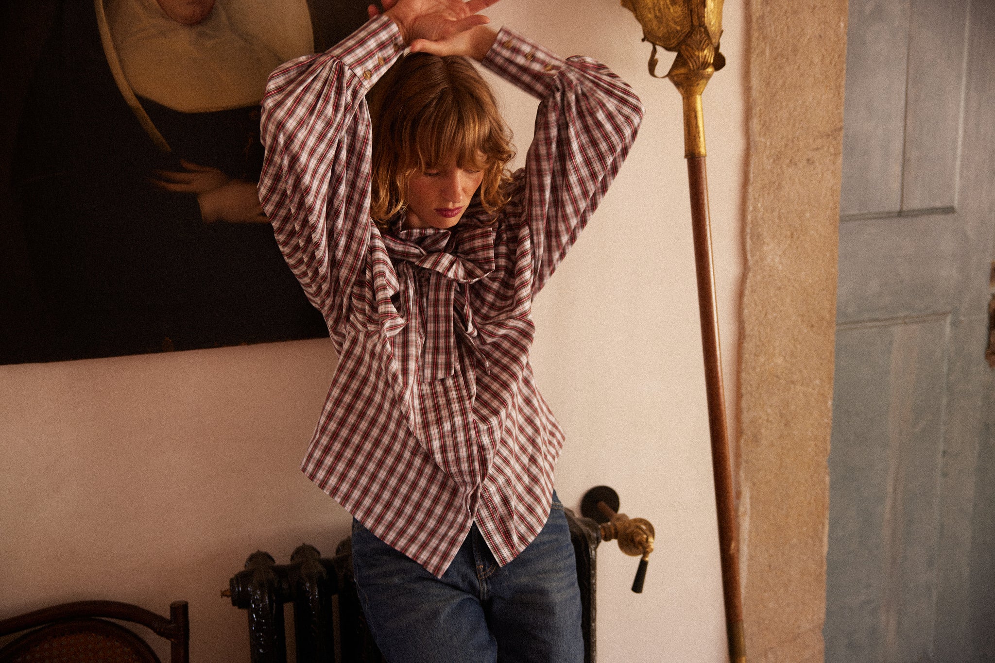 Camisa de cuadros blanca y roja para mujer, confeccionada en tejido 100% algodón de alta calidad. Diseño con cuello con volante y lazo, mangas abullonadas y puños con volantes que aportan un estilo femenino y actual.