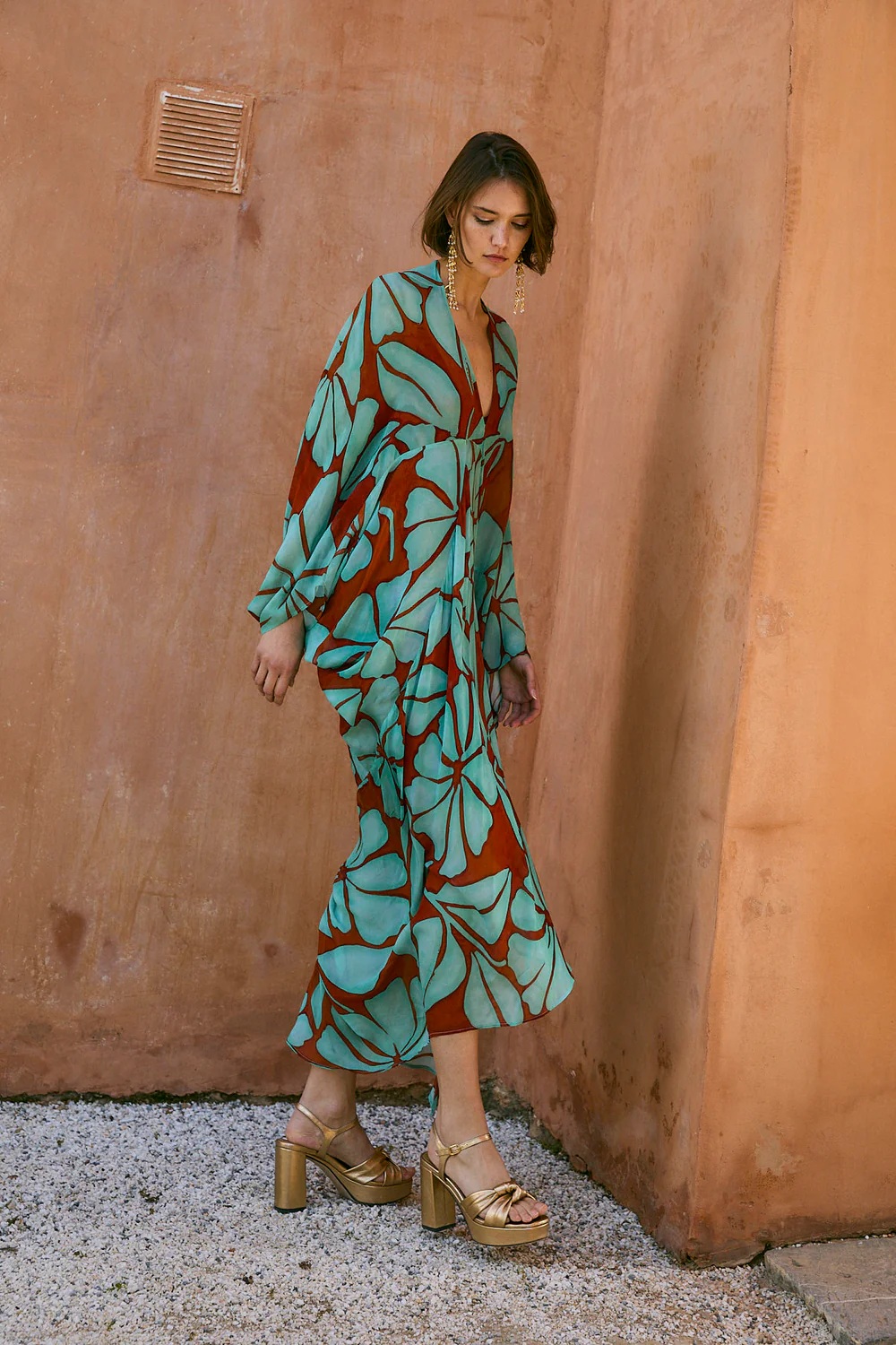 Vestido largo y fluido con estampado turquesa, diseñado con escote en pico profundo y mangas amplias tipo murciélago que aportan movimiento y elegancia.