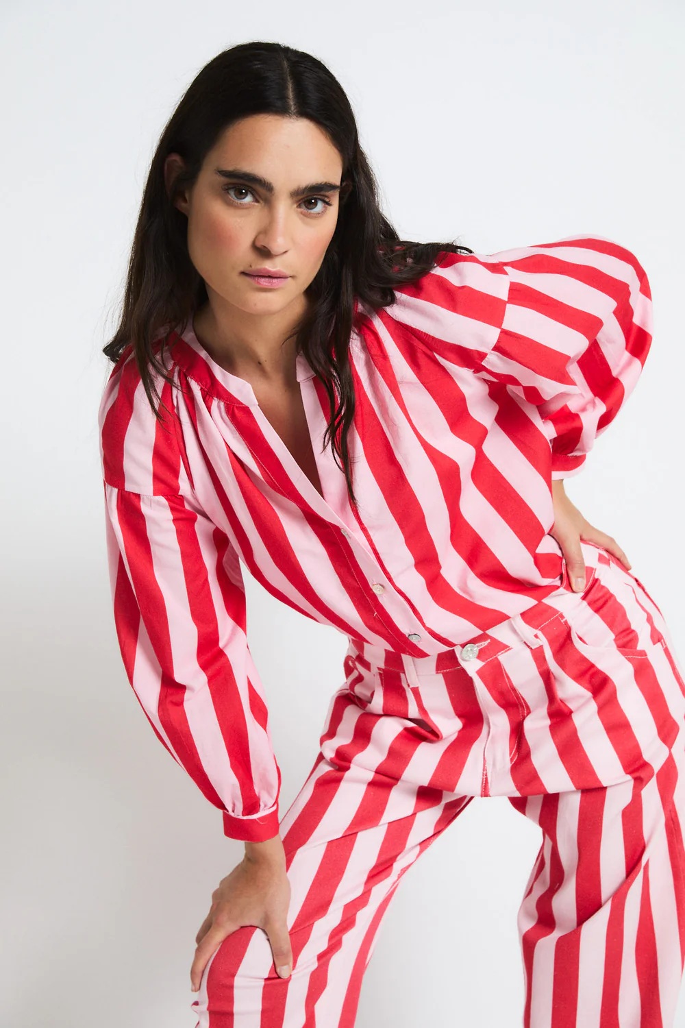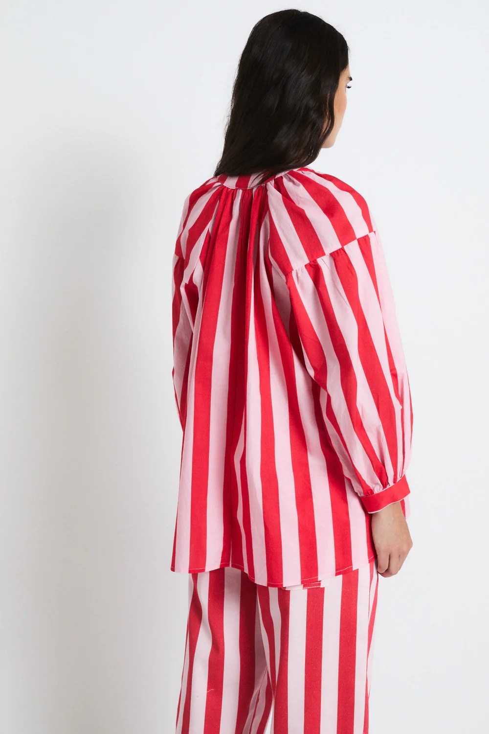 Blusa de corte amplio con rayas verticales en rojo y rosa, ideal para un look fresco y favorecedor.