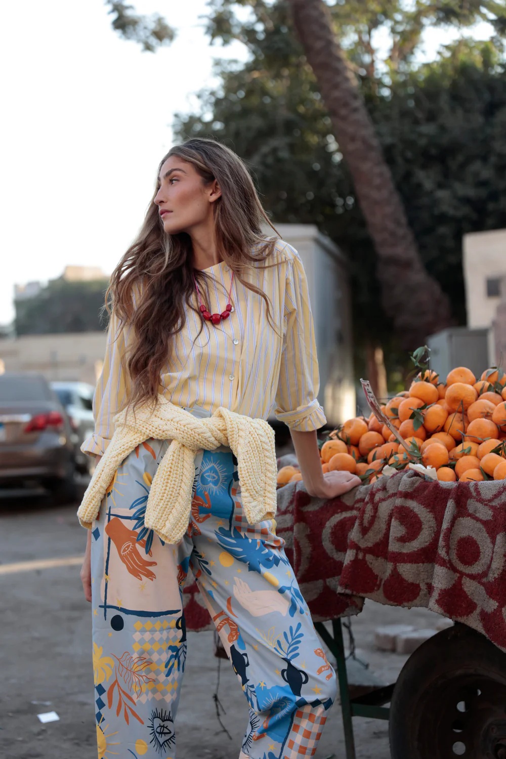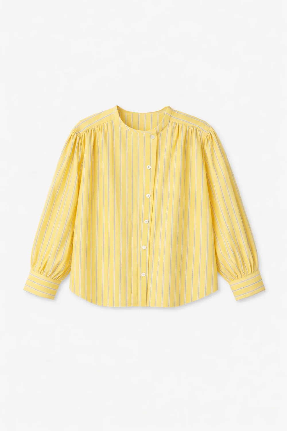 Blusa de corte amplio y estilo relajado confeccionada en tejido de rayas en amarillo pastel, azul y blanco. Presenta escote redondeado y cierre frontal con botones blancos, mientras que sus mangas tres cuartos ligeramente abullonadas con puño aportan un toque femenino y cómodo. Ideal para looks casuales y de entretiempo.