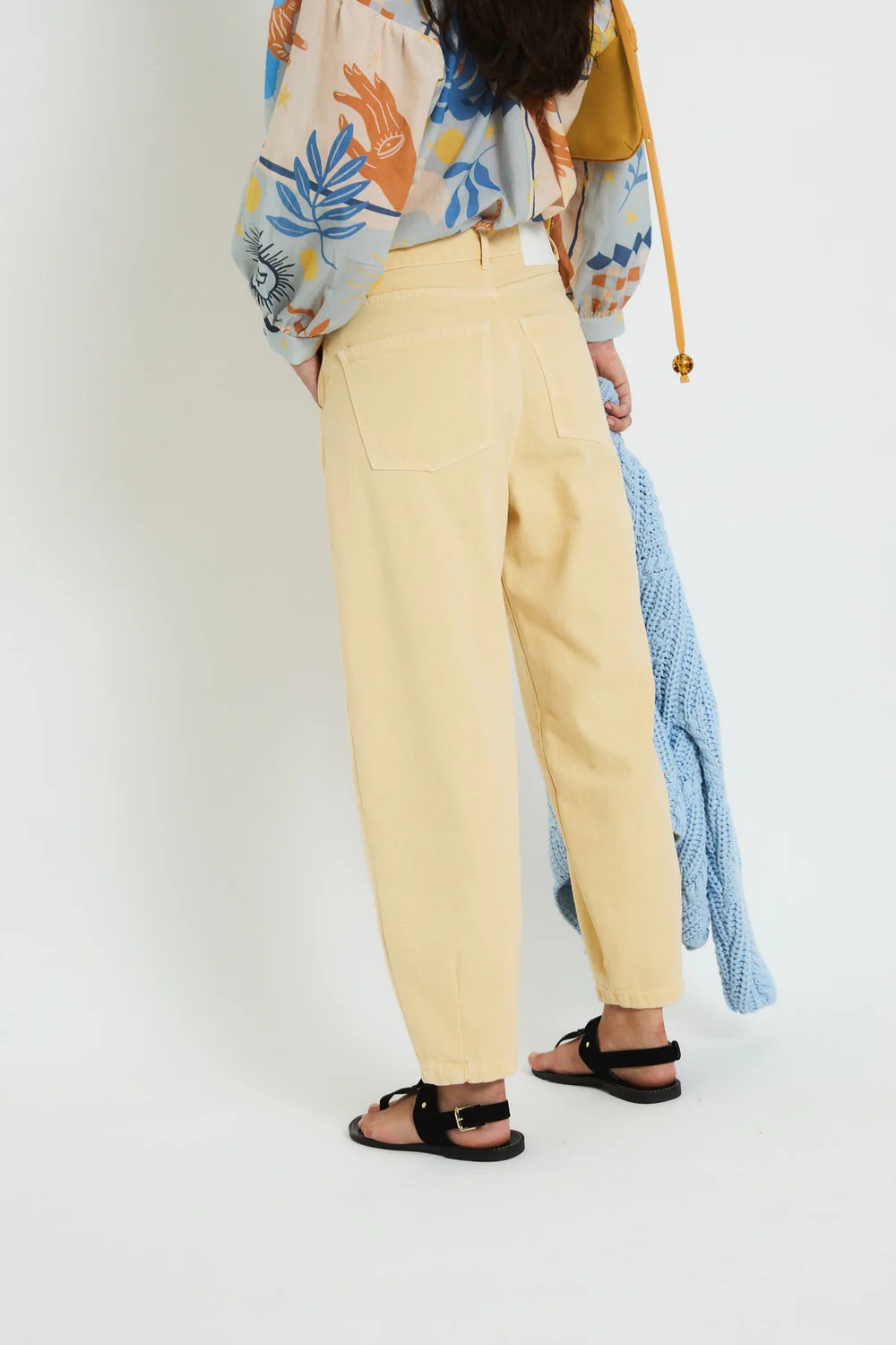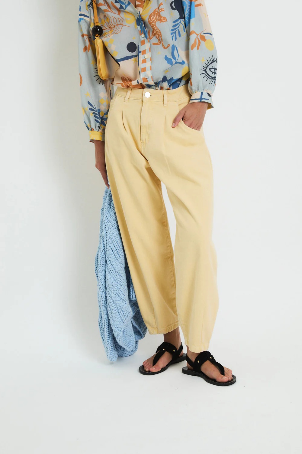 Pantalón vaquero en amarillo pastel de corte relajado, con pinzas delanteras que aportan forma y comodidad. Incorpora bolsillos laterales y cierre de botón con cremallera, ideal para crear looks frescos y luminosos en el día a día.