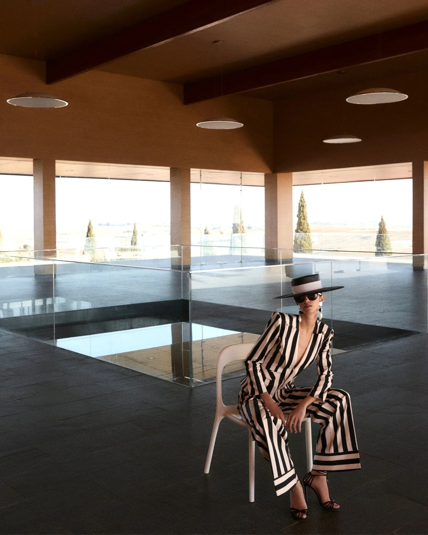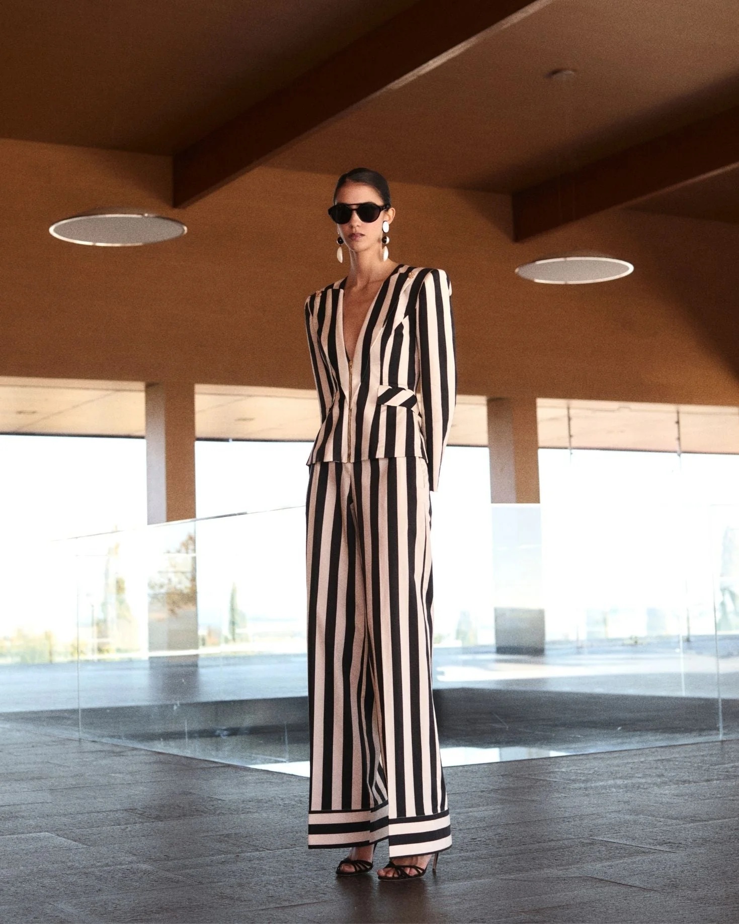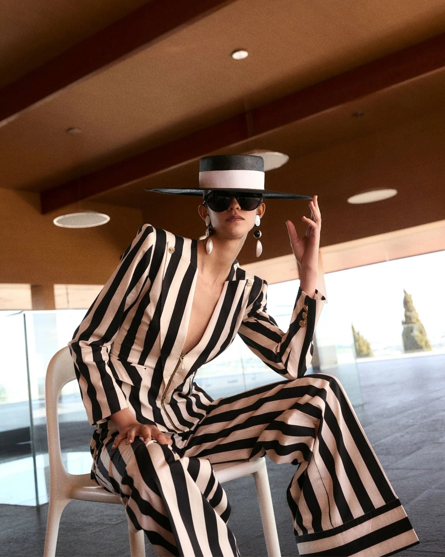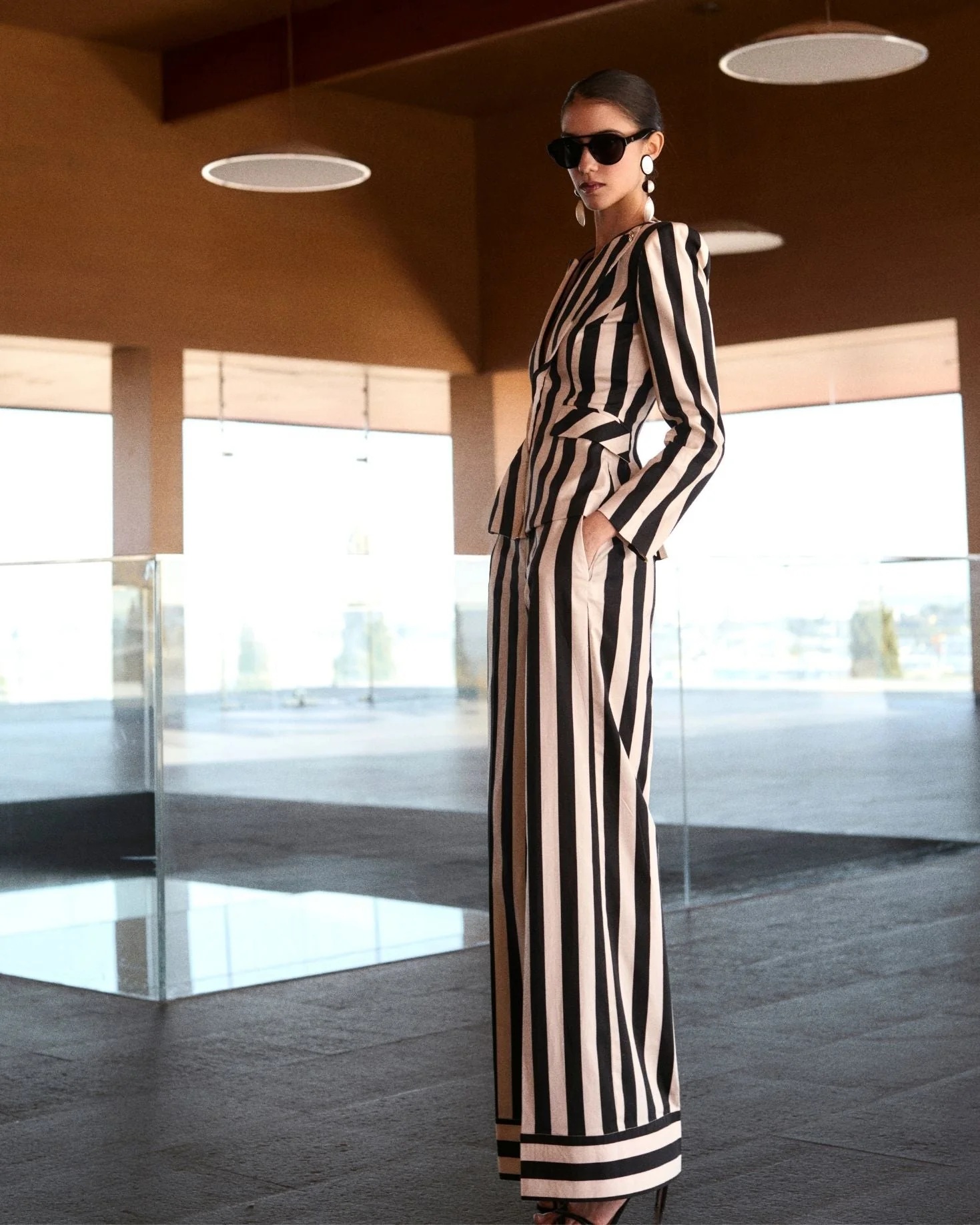 Pantalón de tiro alto con pierna ancha y elegante estampado de rayas en blanco y negro. Un diseño sofisticado y versátil que estiliza la silueta y aporta un toque moderno a cualquier look, ideal tanto para outfits de día como para ocasiones más especiales. Su corte amplio proporciona comodidad y movimiento, convirtiéndolo en una prenda imprescindible en el armario.