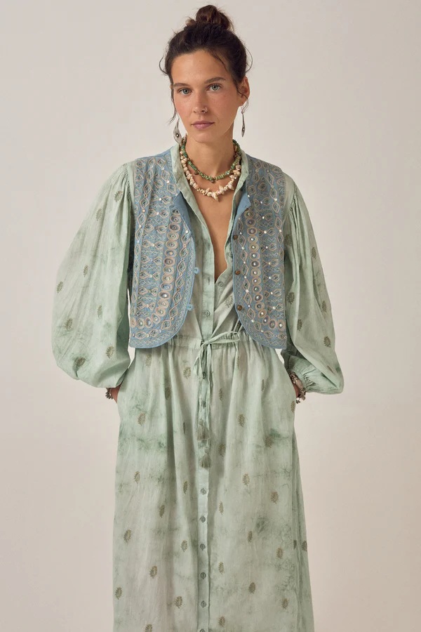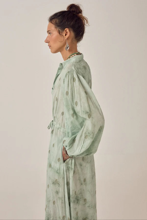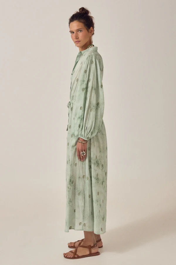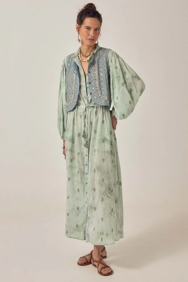 El Vestido Freya Mineral Waves Jade de Maison Hotel es un vestido largo para mujer que combina elegancia bohemia, frescura y comodidad. Su estampado inspirado en formas orgánicas en tonos verdes y jade aporta un estilo natural y sofisticado, perfecto para destacar en cualquier ocasión.
