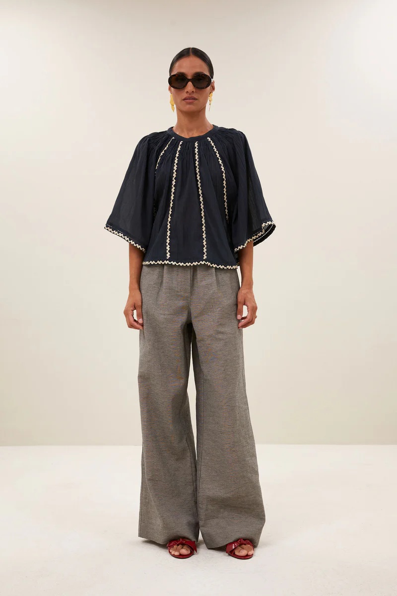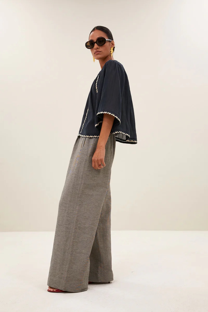 La blusa Emmi se inspira en la estética bohemia contemporánea, donde los detalles bordados y los tejidos naturales crean prendas con personalidad propia. Su tono charcoal aporta profundidad y elegancia, reflejando el ADN de by-bar: moda femenina, cuidada y atemporal.