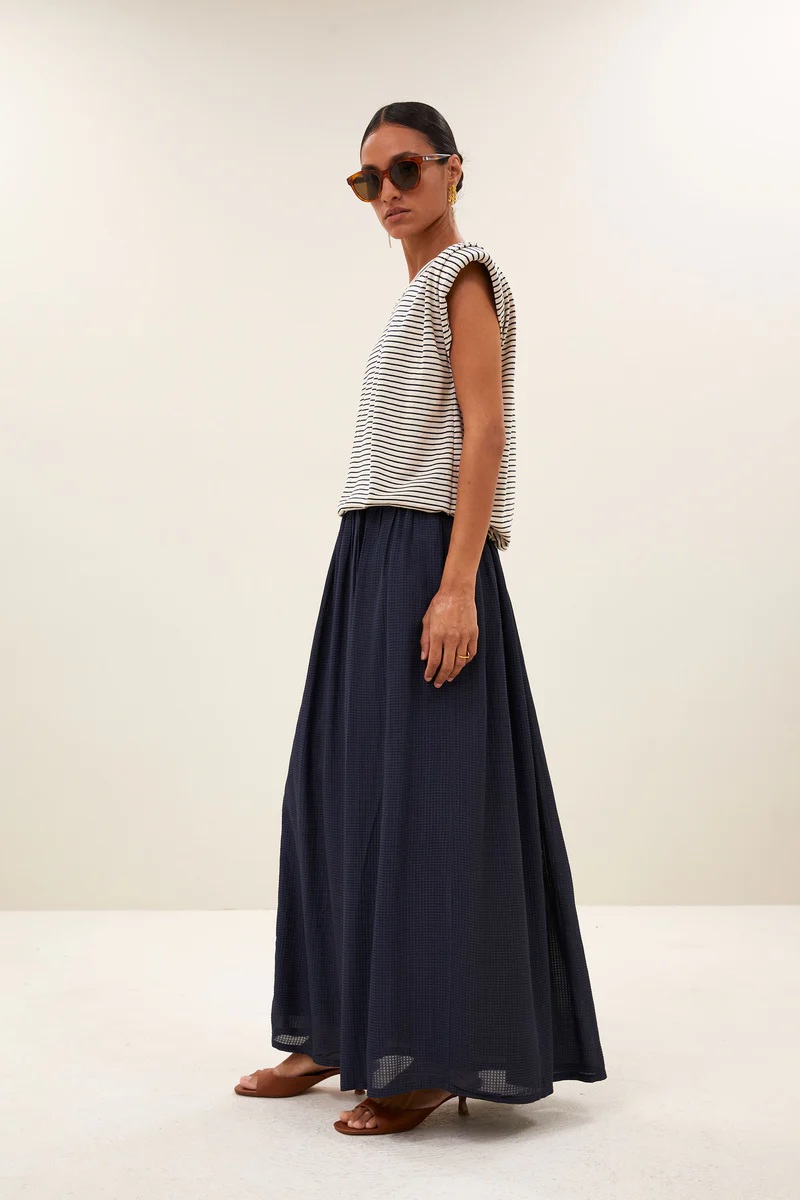 La falda Reva se inspira en el estilo minimalista europeo, donde los tejidos fluidos y los cortes relajados crean prendas atemporales y versátiles. Su tono azul marino evoca elegancia y sobriedad, reflejando el ADN de by-bar: moda femenina, cómoda y sofisticada para el día a día.