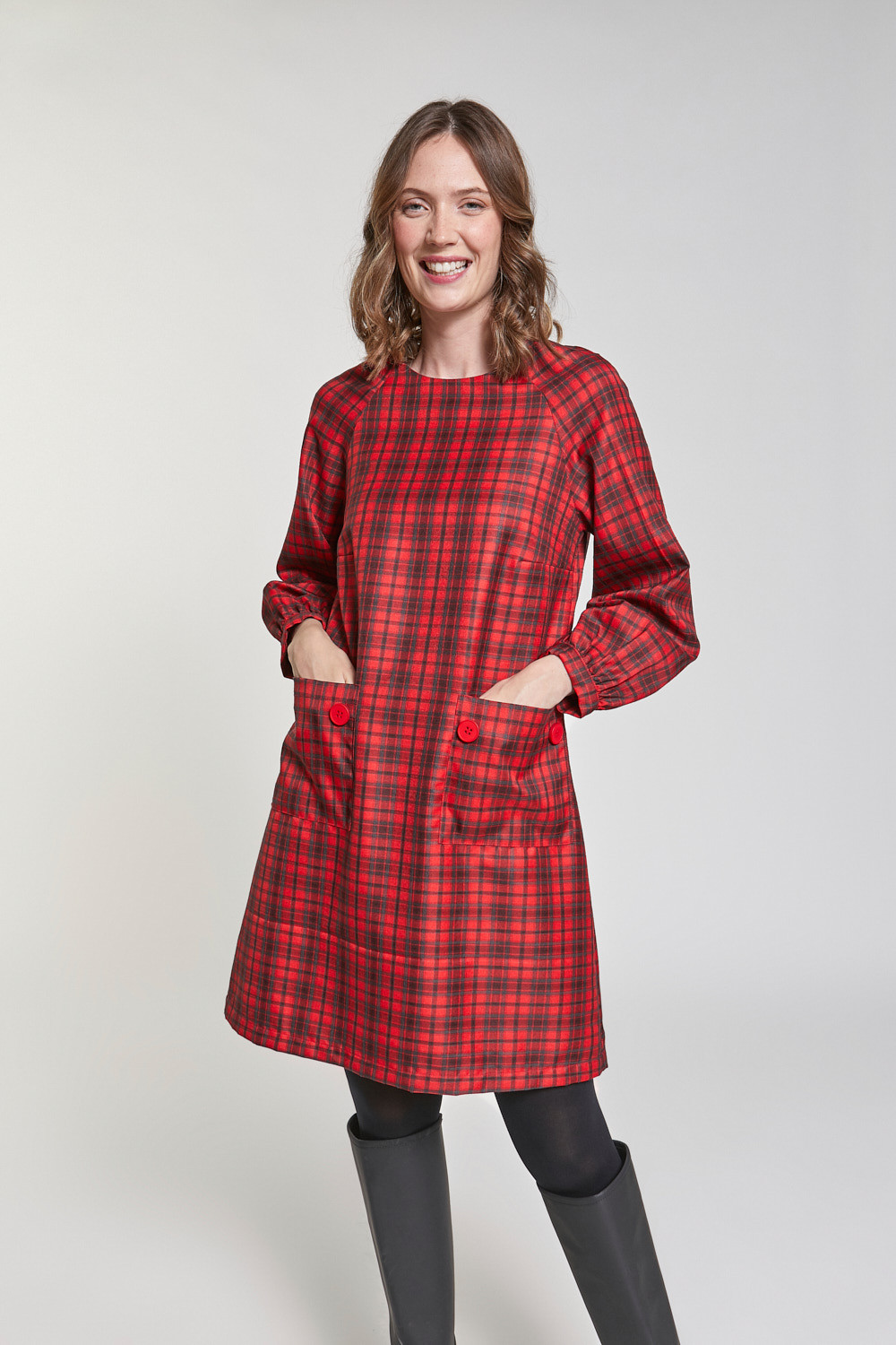 Vestido corto evasé estampado. Tiene escote redondo, manga ranglan larga y bolsillos plastrones delanteros con detalle de botones. Cierre en lágrima con botón en espalda. Largo por debajo de la rodilla. Tiene forro de punto